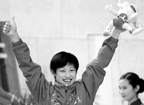 領獎臺上的曹靜在向觀眾致意。□記者 李勇 報道