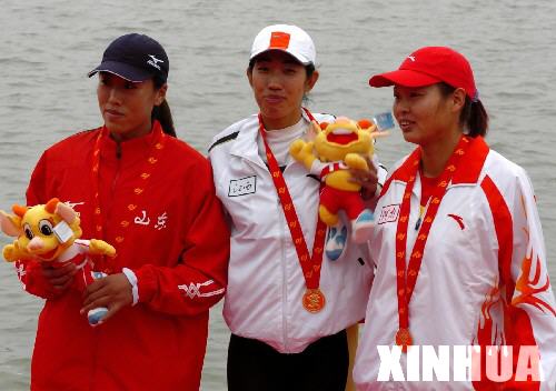 10月14日,在十運會賽艇女子單人雙槳比賽中,江西隊的金紫薇(中)奪得金牌,山東隊的奚愛華(左)獲得銀牌,河南隊的黨俊玲獲得銅牌。