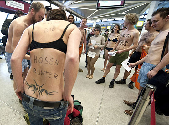 2010年1月10日,德國“海盜黨”(一個宣傳保護個人隱私的小黨派)的約15名成員在柏林機場A航站樓半裸抗議政府引進更為嚴格的機場身體掃描設備。他們身著很少的衣服,一些人還在自己裸露的皮膚上寫著:誰來保護我們的隱私?