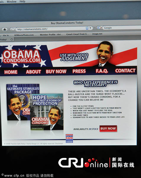 2010年1月13日消息,美國(guó)總統(tǒng)奧巴馬最近實(shí)在有點(diǎn)煩,自從他競(jìng)選總統(tǒng)之初就一直是各大商家制造噱頭的焦點(diǎn),前段時(shí)間的風(fēng)衣廣告風(fēng)波尚未完全平息,一家網(wǎng)站(obamacondom.com)又推出了以他的形象為招牌的避孕套。