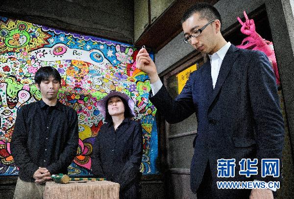 在日本東京舉行的一個離婚儀式上,主持人(右)準備讓離婚的男女用錘子砸結(jié)婚戒指(6月26日攝)。