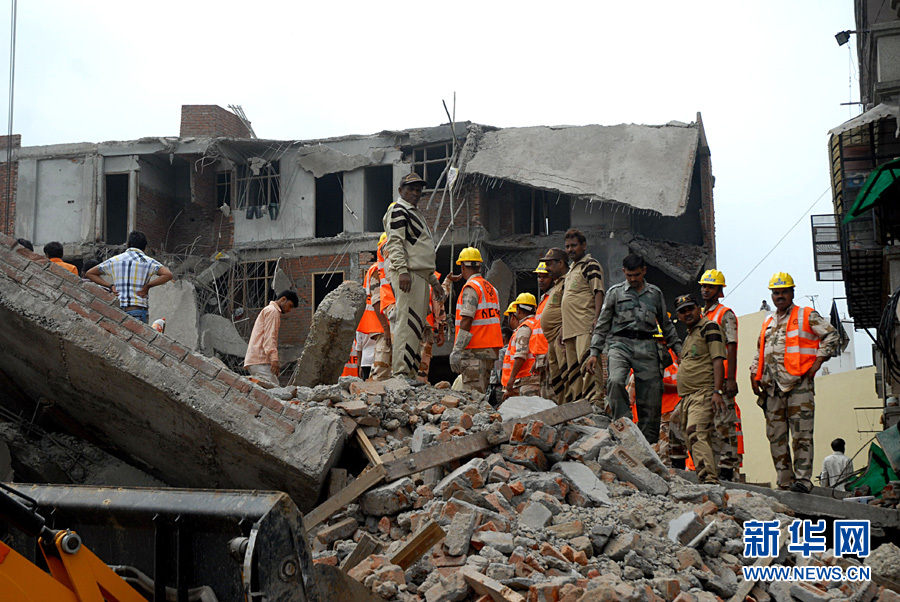 7月17日,在印度首都新德里附近的加濟阿巴德市,救援人員清理坍塌樓房的廢墟并搜尋幸存者。據當地媒體當日報道,這里16日下午發生房屋坍塌事件,造成4人死亡,數十人受傷。新華社發(薩卡爾攝)