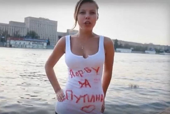 一名少女用口紅在T恤上寫下“我將為普京而脫”的口號。