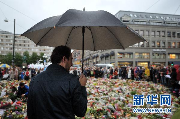 7月24日,在挪威首都奧斯陸,人們冒雨來到奧斯陸大教堂前,哀悼襲擊事件的死難者。挪威奧斯陸政府辦公大樓前22日發生爆炸,之后約2小時,在離奧斯陸約40公里處的于特島又發生一起槍擊案,共造成至少93人死亡。新華社記者王慶欽攝
