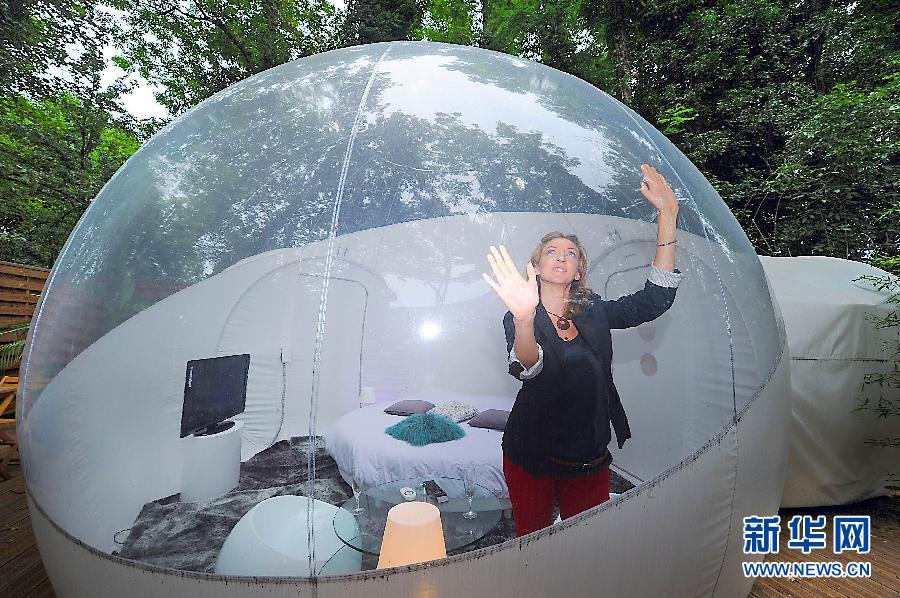 7月26日,一名女士參觀位于法國北部城市魯貝的一間“泡泡房”。這種“泡泡房”由再生塑料制成,使用一架靜音鼓風機保持氣壓。它可作為旅館房間出租,并安置在戶外,使居住者能夠與大自然親密接觸。新華社/法新