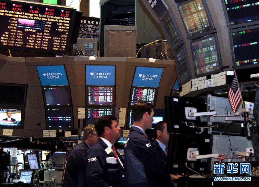 8月8日,交易員在美國紐約證券交易所工作。當日,受標普下調美國主權信用評級影響,紐約股市三大股指全線大幅下挫,道瓊斯指數下跌超過600點,失守11000點關口,標準普爾500指數和納斯達克綜合指數跌幅均超6%。新華社記者王成云攝