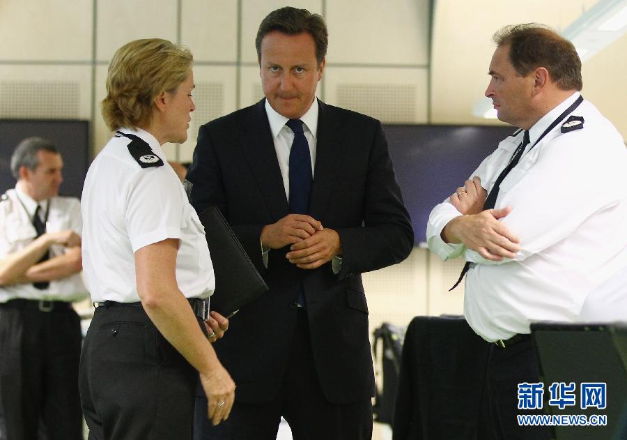 8月10日,英國首相卡梅倫(中)在伯明翰的西米德蘭茲與兩名警察交談。英國首相卡梅倫當日表示,政府正在采取更強有力的行動打擊暴力騷亂,倫敦的局勢已經基本得到控制。英國部分城市發生的騷亂已經持續4天。由于首都倫敦加強了警力,9日晚事態趨緩,但在曼徹斯特、索爾福德、利物浦、諾丁漢、伯明翰等其他城市,小規模的騷亂仍在繼續。新華社/法新