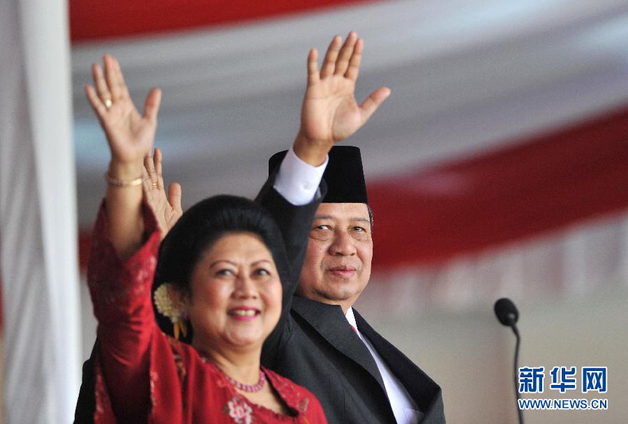 8月17日,在印度尼西亞首都雅加達(dá),印尼總統(tǒng)蘇西洛(右)和夫人參加獨(dú)立日慶祝儀式。
