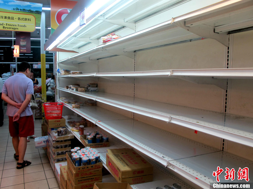 當地時間8月26日晚,颶風“艾琳”來襲,紐約中國人超市貨柜搶空,人們到超市購物儲貨,水和面包是最受歡迎的。圖為一華人超市面包貨柜被搶空。中新社發 孫宇挺 攝