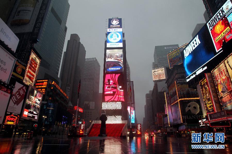 8月28日早晨,美國紐約風(fēng)雨交加,時報廣場上幾乎沒有游客。 颶風(fēng)“艾琳”當(dāng)天早晨9點左右登陸紐約,并減弱為熱帶風(fēng)暴。新華社記者伍婧丹攝