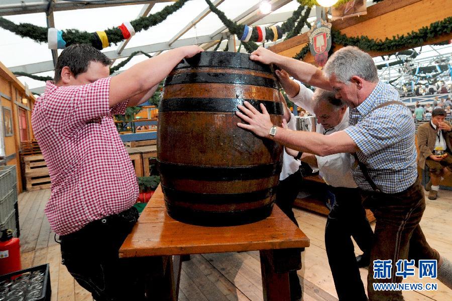 9月17日,在德國巴伐利亞州首府慕尼黑,幾名男子放置啤酒桶以便在啤酒節上供人品嘗。當天,世界上規模最大的民間節日之一——德國慕尼黑啤酒節開幕。 新華社/法新