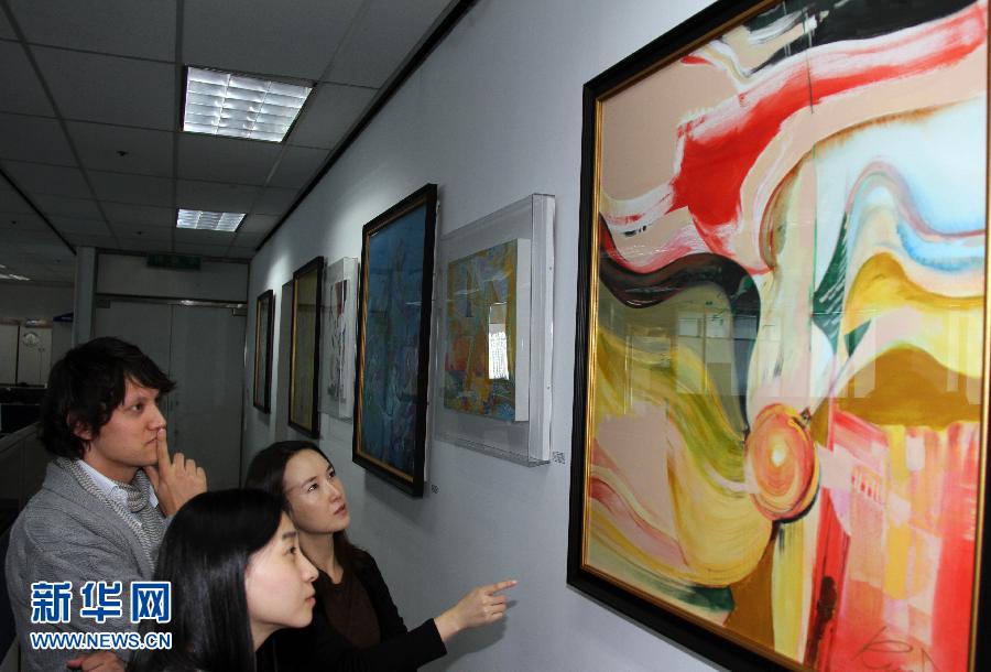 10月25日,韓國首爾妮維雅公司內(nèi),職員欣賞畫展。近日,妮維雅韓國公司為慶祝妮維雅護膚用品品牌創(chuàng)立百年,在首爾辦公室內(nèi)舉行俄羅斯畫家Marianna Kupriyanova的作品展覽,欣賞“辦公室內(nèi)的畫展”成為職員們休息、放松的好方式。 新華社記者 何璐璐 攝