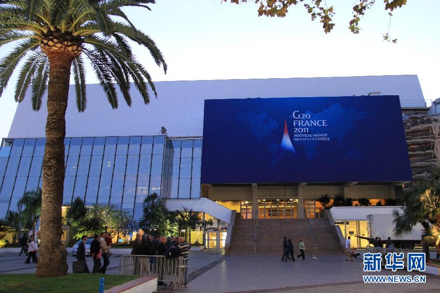 10月30日,在法國戛納,戛納會議中心上方豎起一塊寫有“G20,法國 2011,新世界、新思維”的大牌子。二十國集團峰會(G20)將于11月3日至4日在法國南部海濱城市戛納召開。 新華社記者韋巍攝