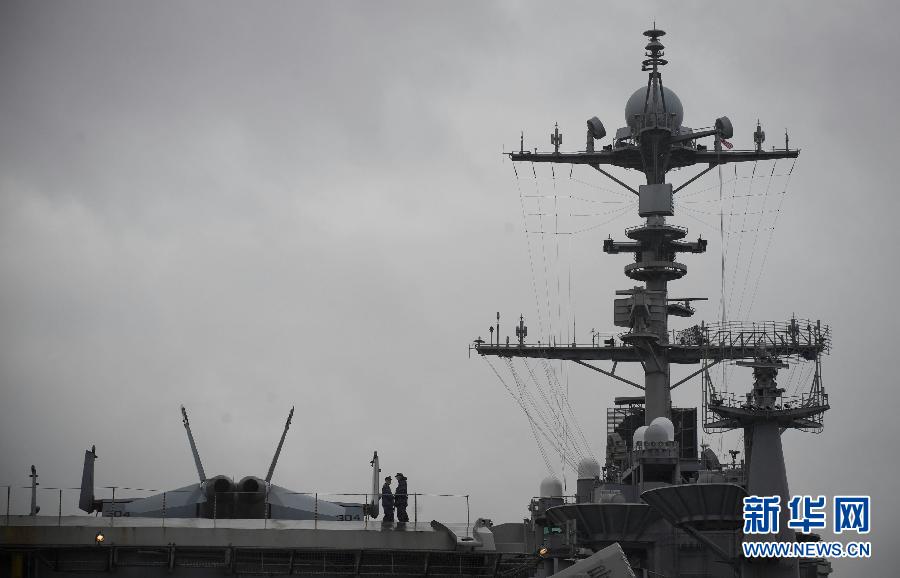 11月9日,兩名美國軍人站在一架戰機前。當日,美國海軍“喬治·華盛頓”號核動力航母在3艘導彈驅逐艦的護衛下在香港水域停靠,進行補給和休整。這是“喬治·華盛頓”號航母第二次經停香港。新華社記者呂小煒攝