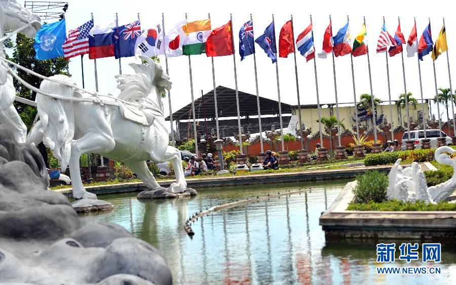 11月14日,在印尼巴厘島一座街心公園旁,旗幟迎風飄揚。東盟系列峰會即將于本月17日在印尼巴厘島舉行。 新華社記者黃曉勇攝