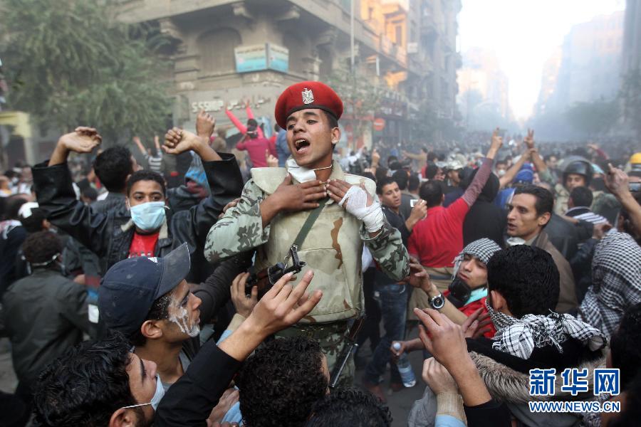 11月22日,在埃及首都開羅解放廣場,一名士兵試圖讓示威者離開。埃及武裝部隊最高委員會主席坦塔維22日晚發表電視講話說,軍方接受謝拉夫內閣的辭呈,將組建民族拯救政府,強調議會選舉將如期舉行。坦塔維說,軍方要求現任內閣在新政府組建之前繼續行使職權,總統選舉最遲在明年6月30日前舉行。新華社/法新