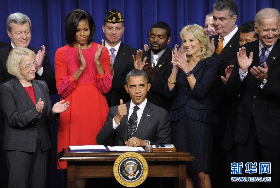 11月21日,在美國首都華盛頓白宮,美國總統奧巴馬(中)簽署一項幫助退伍軍人就業的稅收優惠法案。這是近期奧巴馬政府推動就業努力中首次獲得國會通過并簽署生效的一項舉措。新華社記者張軍攝