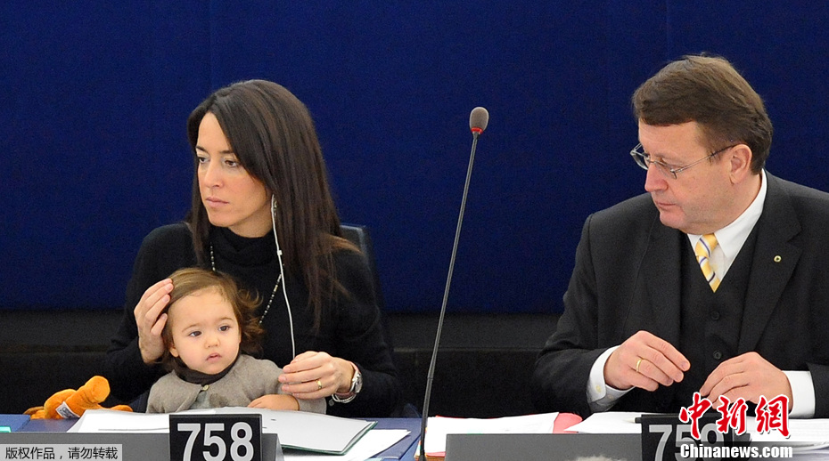 當(dāng)?shù)貢r(shí)間2011年12月14日,法國斯特拉斯堡,歐洲議會(huì)議員Licia Ronzulli帶著自己的女兒開會(huì)。