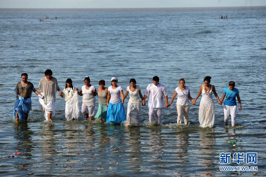 2月2日,阿根廷的非洲裔和巴西裔移民在首都布宜諾斯艾利斯的拉普拉塔河邊舉行傳統的“水神節”祭祀活動,祈禱水神的保佑。新華社/美洲通訊社