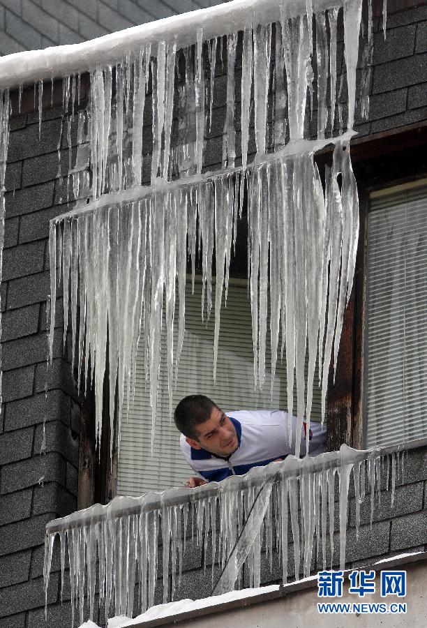 2月2日,在塞爾維亞西南部城市烏日策,一名男子從布滿冰柱的窗口向外張望。