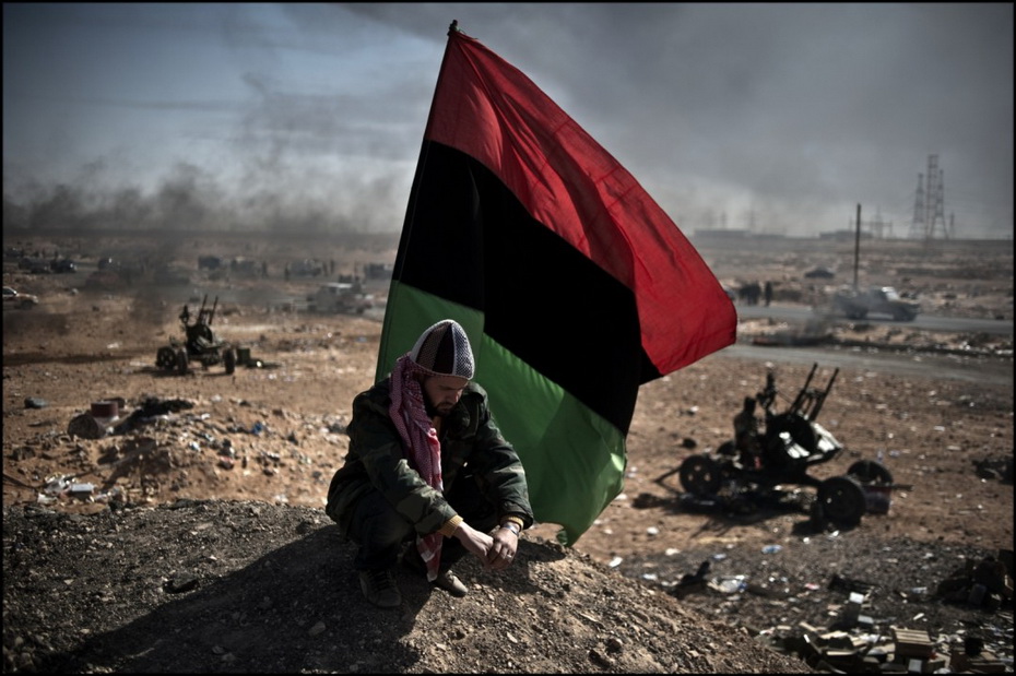 當(dāng)時利比亞反對派的一名武裝者在石油城鎮(zhèn)拉斯拉努夫的戰(zhàn)場中蹲在反對派旗幟旁邊休息。