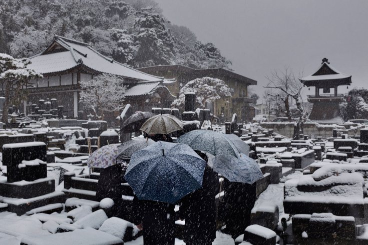 2012年2月25日。日本,石卷市。圖為一家人為死難的親人祈禱。該墓地被壓在廢墟之下,因此直到現(xiàn)在葬禮才得以舉行。