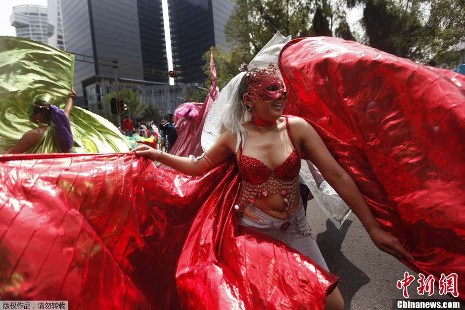 當地時間3月18日,墨西哥首都墨西哥城,一名女子在雷福馬大道(Reforma Avenue)上參加狂歡節游行,迎接“春暖花開”。