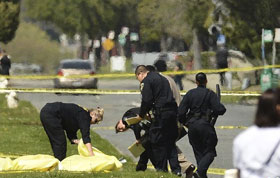 4月3日,在美國加利福尼亞州奧克蘭市的奧伊科斯大學,警方人員在發(fā)生槍擊案的校園取證。