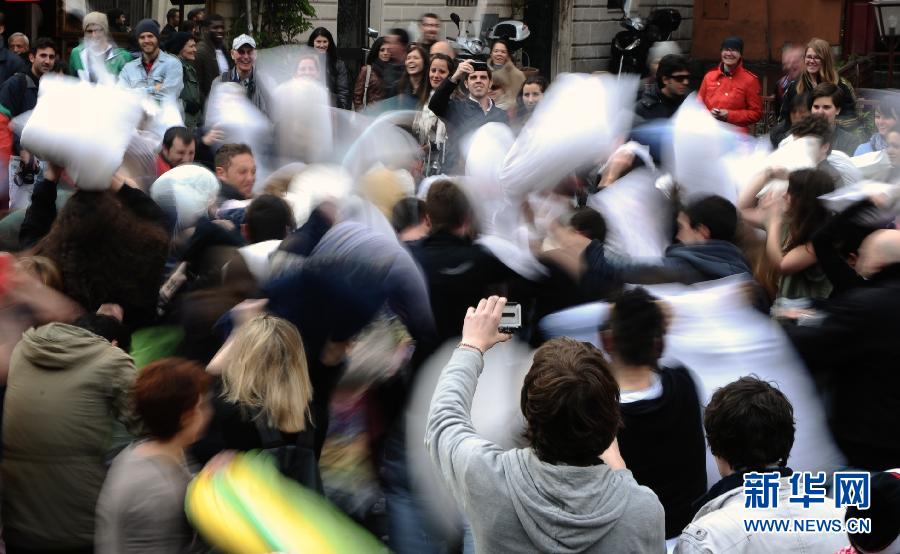 4月15日,在意大利羅馬特拉斯泰韋雷區(qū)的圣瑪麗亞廣場,人們參加一年一度的“枕頭大戰(zhàn)”。 新華社記者王慶欽攝