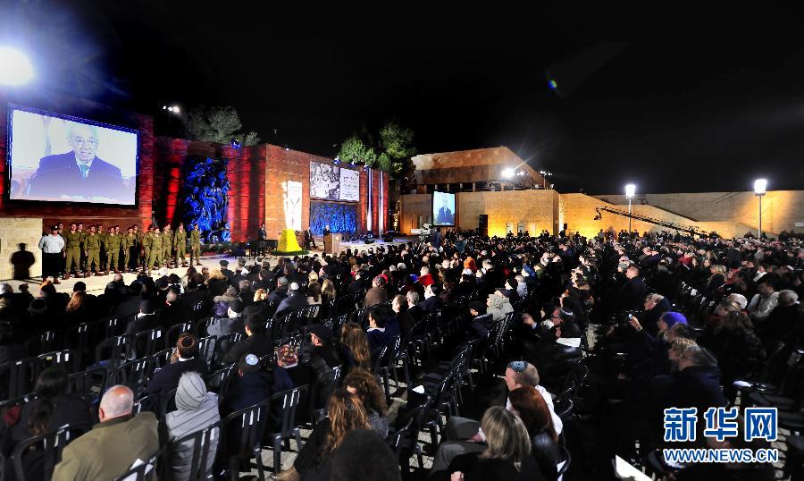 4月18日晚,在以色列亞德韋希姆大屠殺紀念館,以色列總統佩雷斯在二戰大屠殺紀念活動開始儀式上發言。當天,以色列全國舉行各種活動,紀念一年一度的大屠殺紀念日,悼念在第二次世界大戰中死難的600萬猶太人。以色列大屠殺紀念日是根據猶太歷法確定的,按照公元紀年每年則有所不同。新華社記者尹棟遜攝