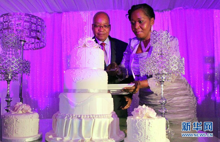 4月20日,在南非夸祖魯-納塔爾省的恩康德拉村,南非總統祖馬與夫人在婚禮上切蛋糕。南非總統祖馬當天在其家鄉夸祖魯-納塔爾省的恩康德拉村迎娶了他的現任第四位妻子班吉·恩格瑪。這是今年70歲的祖馬第6次結婚。南非法律允許一夫多妻制。祖魯人是南非最大的黑人部族,該部族有一夫多妻的傳統。自南非種族隔離制度于1994年結束以來,祖馬是該國第一個同時擁有數位妻子的總統。新華社發(梁銓攝)