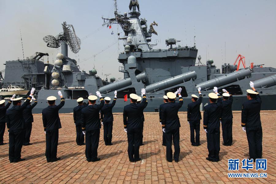 4月27日,海軍官兵向駛離碼頭的俄羅斯海軍“瓦良格”號導彈巡洋艦揮手致意。當日,在圓滿完成了為期6天的演習任務后,參加“海上聯合-2012”中俄聯合海上軍演的俄方艦艇陸續駛離青島。 新華社記者 查春明 攝