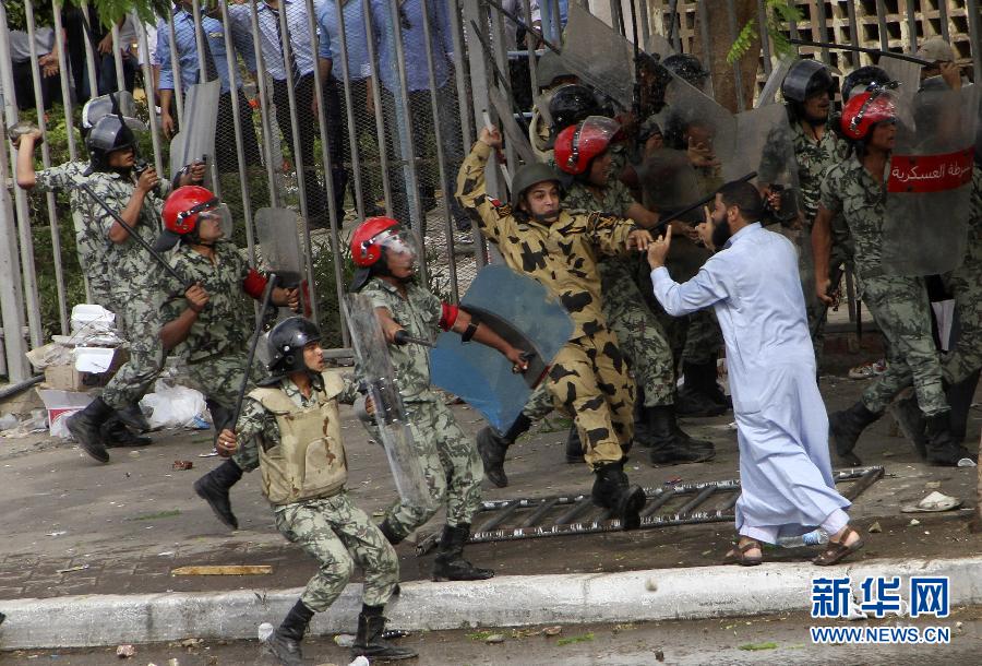 5月4日,在埃及首都開(kāi)羅,示威者與軍隊(duì)士兵發(fā)生沖突。埃及首都開(kāi)羅數(shù)萬(wàn)民眾4日再次分別聚集在開(kāi)羅兩大廣場(chǎng),對(duì)日前在國(guó)防部附近發(fā)生沖突,導(dǎo)致大量人員傷亡的事件表示憤怒,要求軍方如期交權(quán)。駐守在國(guó)防部的軍警與示威民眾間當(dāng)天再次爆發(fā)沖突,導(dǎo)致59人受傷。新華社/美聯(lián)