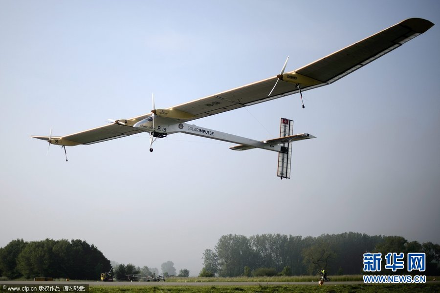當地時間2012年5月24日,瑞士佩耶納,瑞士公司Solar Impulse總裁兼飛行員Andre Borschberg駕駛太陽能動力試驗機Solar Impulse飛機,他將駕駛該測試機進行首次跨洲際飛行,目的地為摩洛哥拉巴特。它將在西班牙馬德里降落,進行技術停留,并更換飛行員。