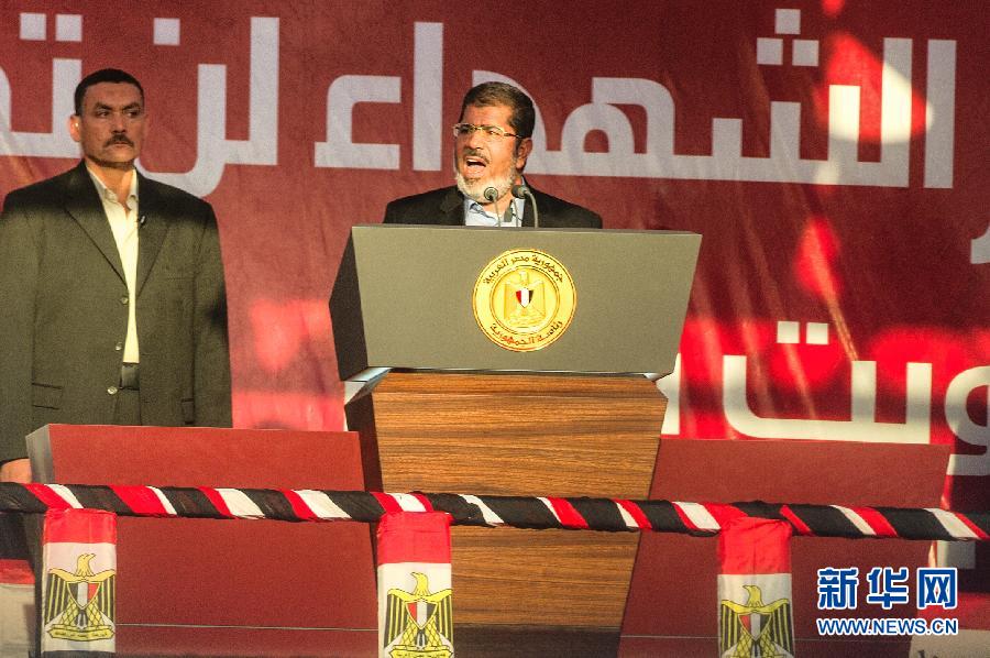 6月29日,在埃及開羅解放廣場,埃及當(dāng)選總統(tǒng)穆爾西發(fā)表講話。 新華社記者李木子攝