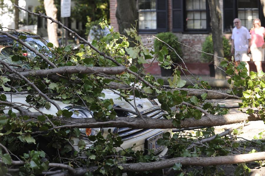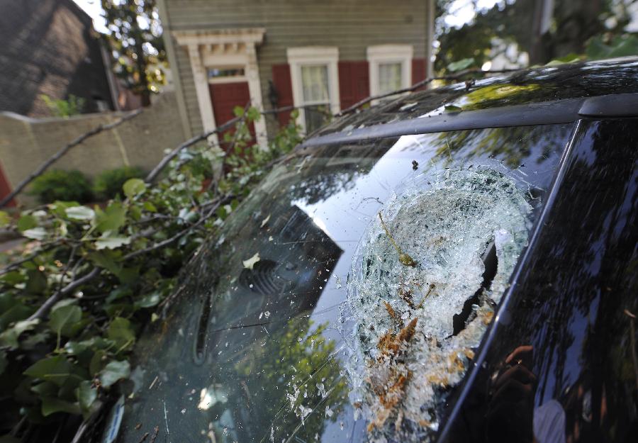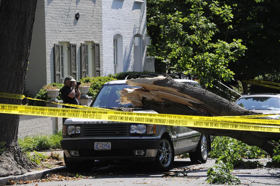 新華社照片,華盛頓,2012年6月30日 (國際)(3)美國東部遭受暴風雨襲擊6月30日,在美國首都華盛頓,一輛汽車的擋風玻璃被樹砸壞。 包括首都華盛頓在內的美國東部多個地區29日晚至30日早遭遇暴風雨天氣,造成3人死亡和大面積斷電,預計超過200萬人受到影響。新華社記者張軍攝