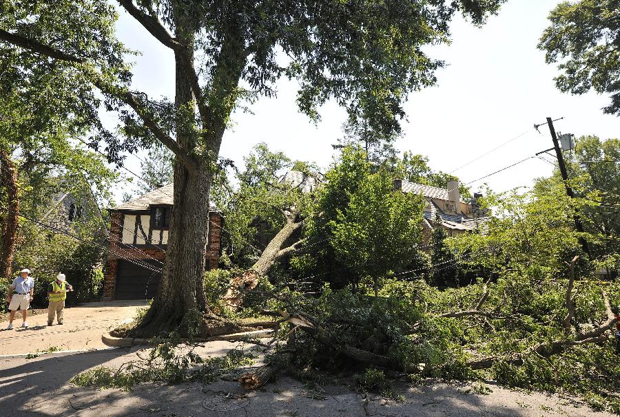 新華社照片,華盛頓,2012年6月30日 (國際)(7)美國東部遭受暴風雨襲擊6月30日,在美國首都華盛頓,當地居民清理在暴風雨中被吹倒的大樹。 包括首都華盛頓在內的美國東部多個地區29日晚至30日早遭遇暴風雨天氣,造成3人死亡和大面積斷電,預計超過200萬人受到影響。新華社記者張軍攝
