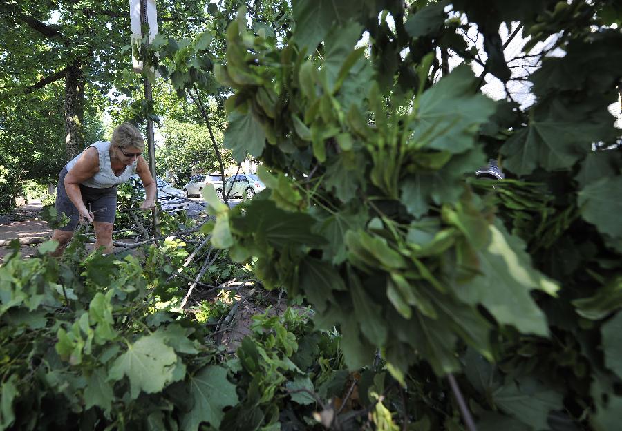 新華社照片,華盛頓,2012年6月30日 (國際)(5)美國東部遭受暴風雨襲擊6月30日,在美國首都華盛頓,一名當地居民清理被暴風雨吹落的樹枝。 包括首都華盛頓在內的美國東部多個地區29日晚至30日早遭遇暴風雨天氣,造成3人死亡和大面積斷電,預計超過200萬人受到影響。新華社記者張軍攝