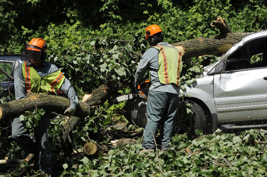新華社照片,華盛頓,2012年6月30日 (國際)(9)美國東部遭受暴風雨襲擊6月30日,在美國首都華盛頓,工人清理在暴風雨中被風吹倒的大樹。 包括首都華盛頓在內的美國東部多個地區29日晚至30日早遭遇暴風雨天氣,造成3人死亡和大面積斷電,預計超過200萬人受到影響。新華社記者張軍攝