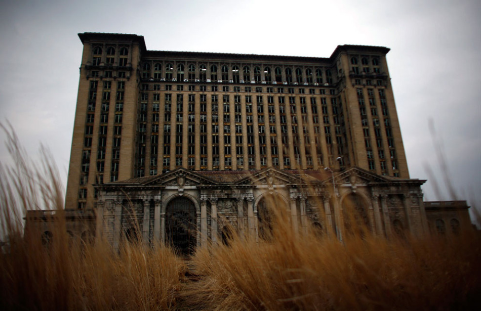 美國密歇根州底特律廢棄的中央車站,野草叢生,景象荒涼。