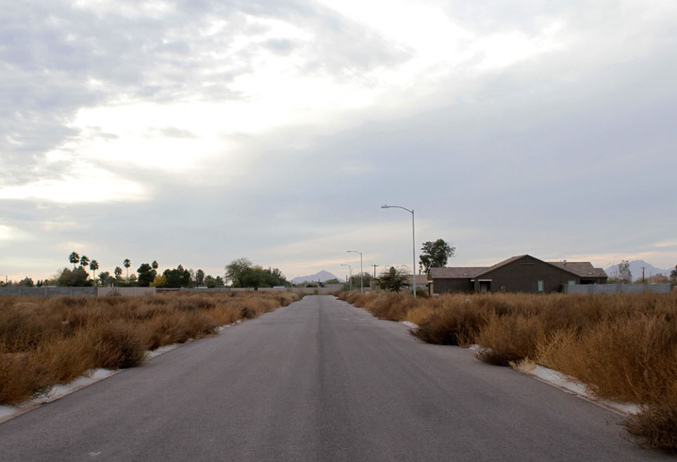 美國亞利桑那州庫利奇一個(gè)未完工的建筑項(xiàng)目,公路兩旁野草叢生。