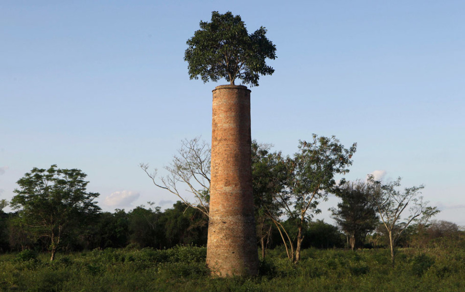 巴拉圭亞松森郊外的一家廢棄工廠,煙囪頂部長出一棵樹。