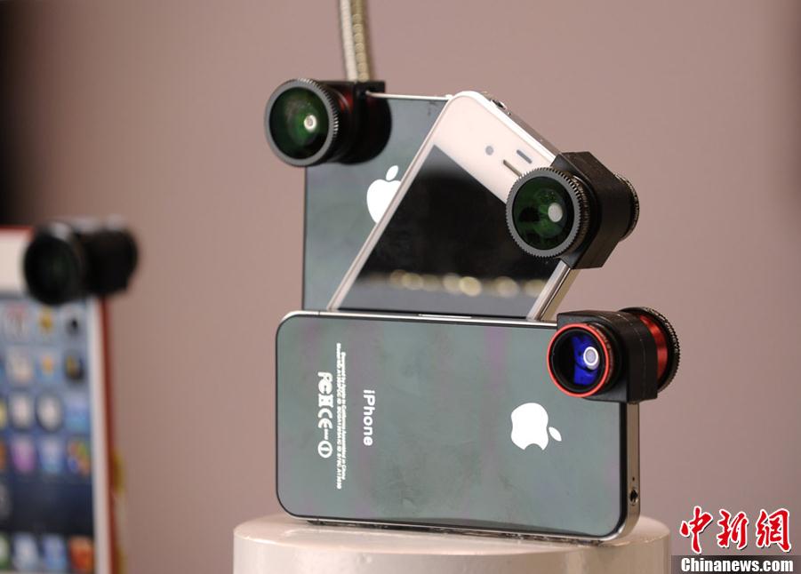 美國舊金山馬士孔尼會議中心,麥金塔世界展覽會(MacworldExpo)開幕。圖為為蘋果手機設計的三合一鏡頭,可用微距、廣角和魚眼拍攝。中新社發 陳鋼 攝