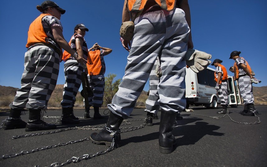 這一場景不禁讓人聯想到20世紀之交的南方腹地:12名身著身著條紋囚服的囚犯,在路旁工作,他們的腳銬在一起,眉毛淌著汗水。