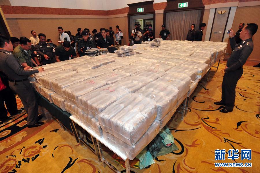 6月14日,在泰國曼谷警察總部舉行的記者會上,泰國警方向媒體展示繳獲的毒品大麻。這批大麻重達(dá)2500公斤,是泰國警方在泰國東北部的烏汶府繳獲的。 新華社發(fā)(拉亨攝)