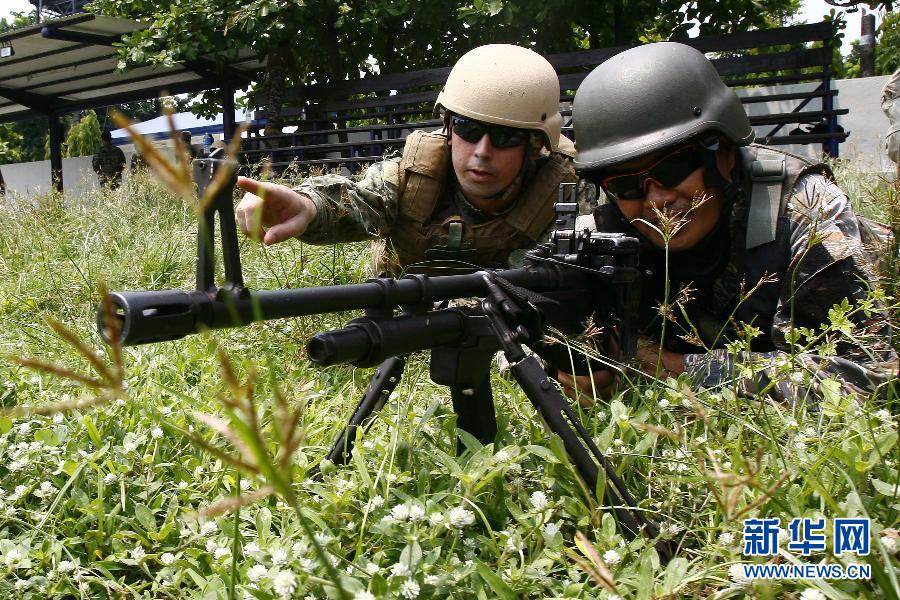 菲律賓與美國海軍27日開始在南海舉行代號為“卡拉特”的聯合軍事演習。此次軍演將持續到7月2日,演習地點位于菲北部的呂宋島三描禮士沿海地區,內容包括聯合兩棲登陸演習、海上安全行動、“海洋權益”意識、情報共享、叢林戰以及“人道主義”救援和救災等活動。新華社發(烏馬利攝)