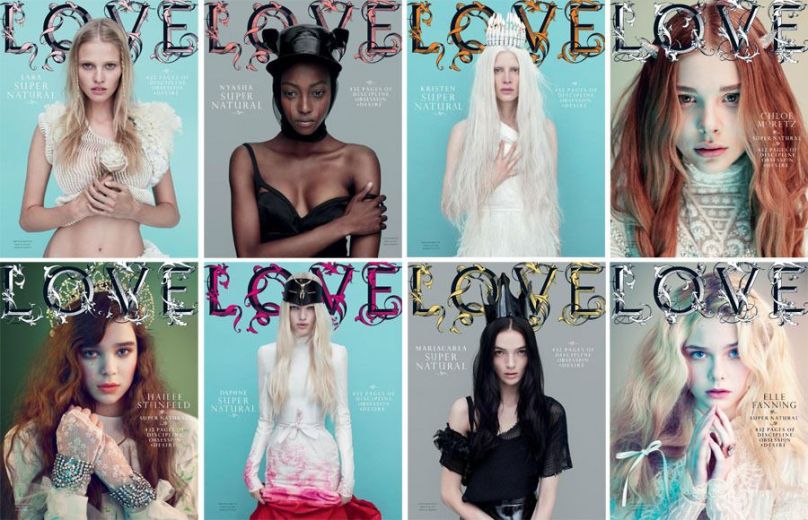 著名時尚雜志《LOVE》的第六期,以8個封面之巨,展現(xiàn)Kristen McMenamy, Daphne Groeneveld, NyashaMatonhodze, LaraStone, Mariacarla Boscono,Hailee Steinfeld, Elle Fanning以及Chloe Moretz等超模垂淚的模樣。