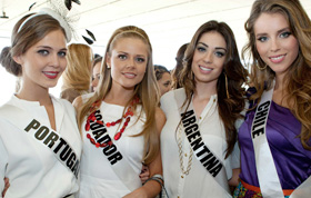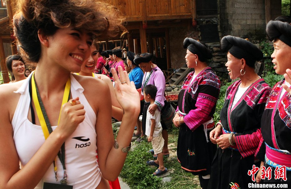 8月29日,正在廣西桂林參加2011亞洲超級模特大賽總決賽的36位佳麗,來到龍勝壯鄉古寨體驗民風,受到當地壯族、瑤族村民的熱烈歡迎。圖為各國參賽佳麗與壯族、瑤族村民一起相互交流、歡歌笑語。中新社發 錢興強 攝