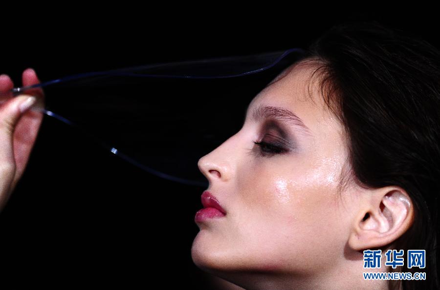 9月18日,在西班牙馬德里時裝周上,造型師為一名模特補(bǔ)妝。 2012馬德里春夏時裝周于9月16日至20日舉行。 新華社記者陳海通攝