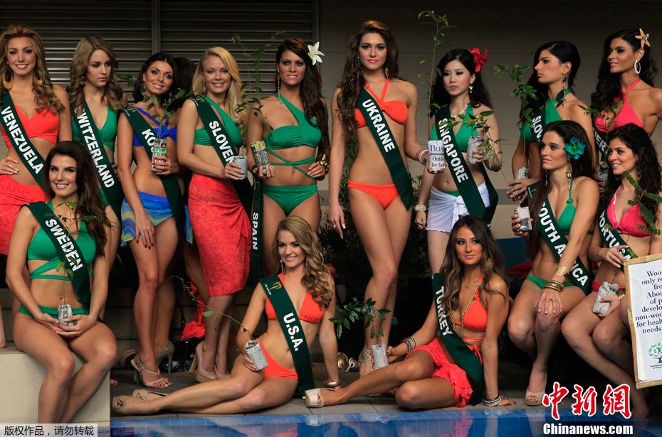 2011年11月22日,在菲律賓馬尼拉,來自世界多國的90多名地球小姐參賽佳麗們,在泳池邊身著比基尼集體亮相,宣傳環(huán)保理念。